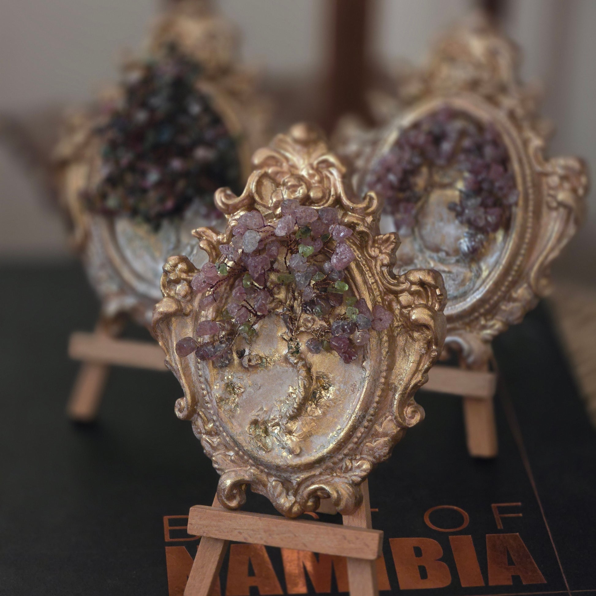 Yes. Each gemstone tree is wire-wrapped by hand and placed in a hand-molded cold ceramic baroque frame. No two pieces are exactly alike.
